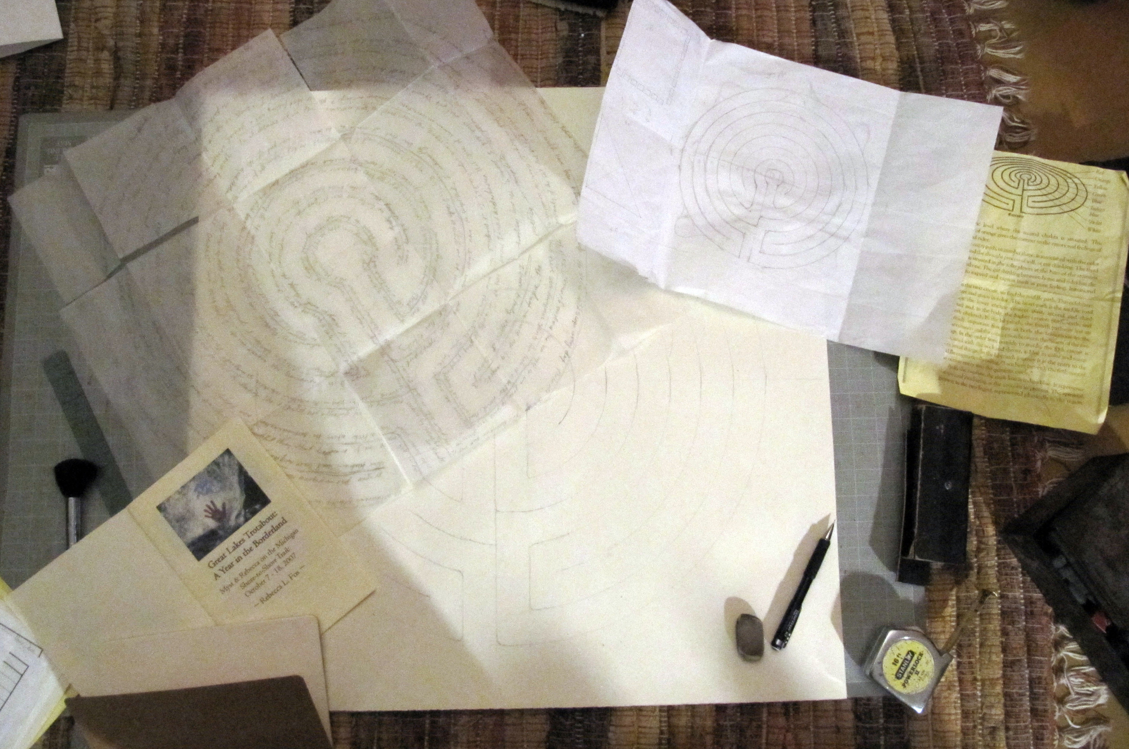 For me the labyrinth is a symbol for pilgrimage and a tool for moving meditation. Several summers ago I created the Trotabout Labyrinth: a seven-circuit, seventy-foot labyrinth that is large enough for two people to walk side-by-side or for a horse and rider. It is dedicated to working in tandem. The Troutabout Labyrinth was part of a much larger project that involved riding my horse, Myst, across the state of Michigan. I serendipitously made the decision to come home the day before tornados went through the forest that I would have been riding through the next day. Safe at home while the storms raged outside, I wrote an essay about this trek. The text from this essay will be the crumb trail through the sketchbook labyrinth.