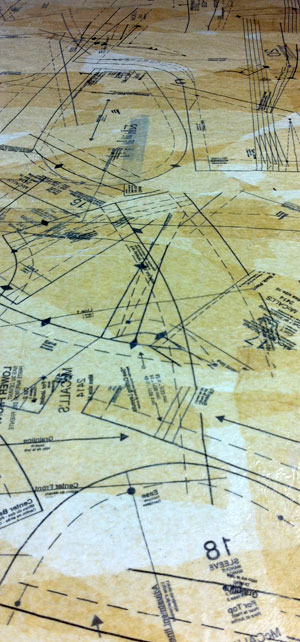 I took out the glue squirt bottle again, and I doused my unsuspecting paper cloth with my glue dilution. Then I applied the sewing pattern paper using a brayer.
