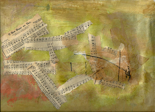 After nap time, I applied some sheet music, covered by another piece of pattern paper, to the inked-up area.