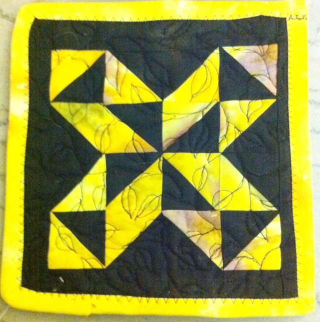 This is a potholder. I made it this weekend using a couple of orphan blocks and a section of a retired bath towel.