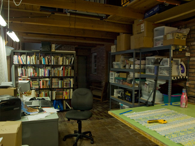 Still, I have not yet figured out where everything should go, so it’s piled on shelves and tucked into corners. Here’s why: my last studio was custom designed and built by my husband and me to maximize storage and work space. I designed it for two sewing machines and a serger, my enormous drafting table, all of my books, and my embarrassingly large collection of fabrics and art supplies, plus a design wall. However, it had no windows.