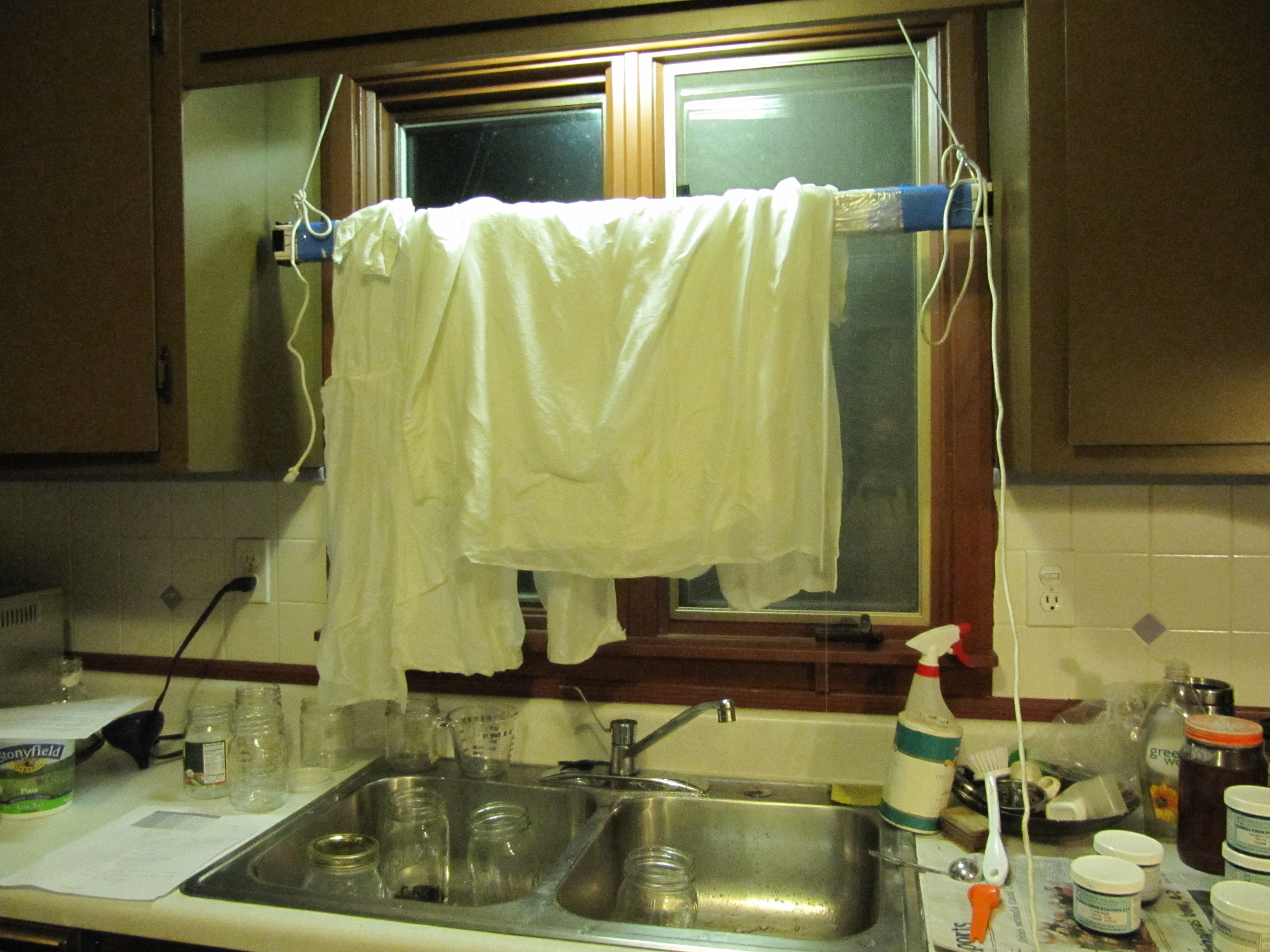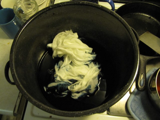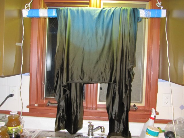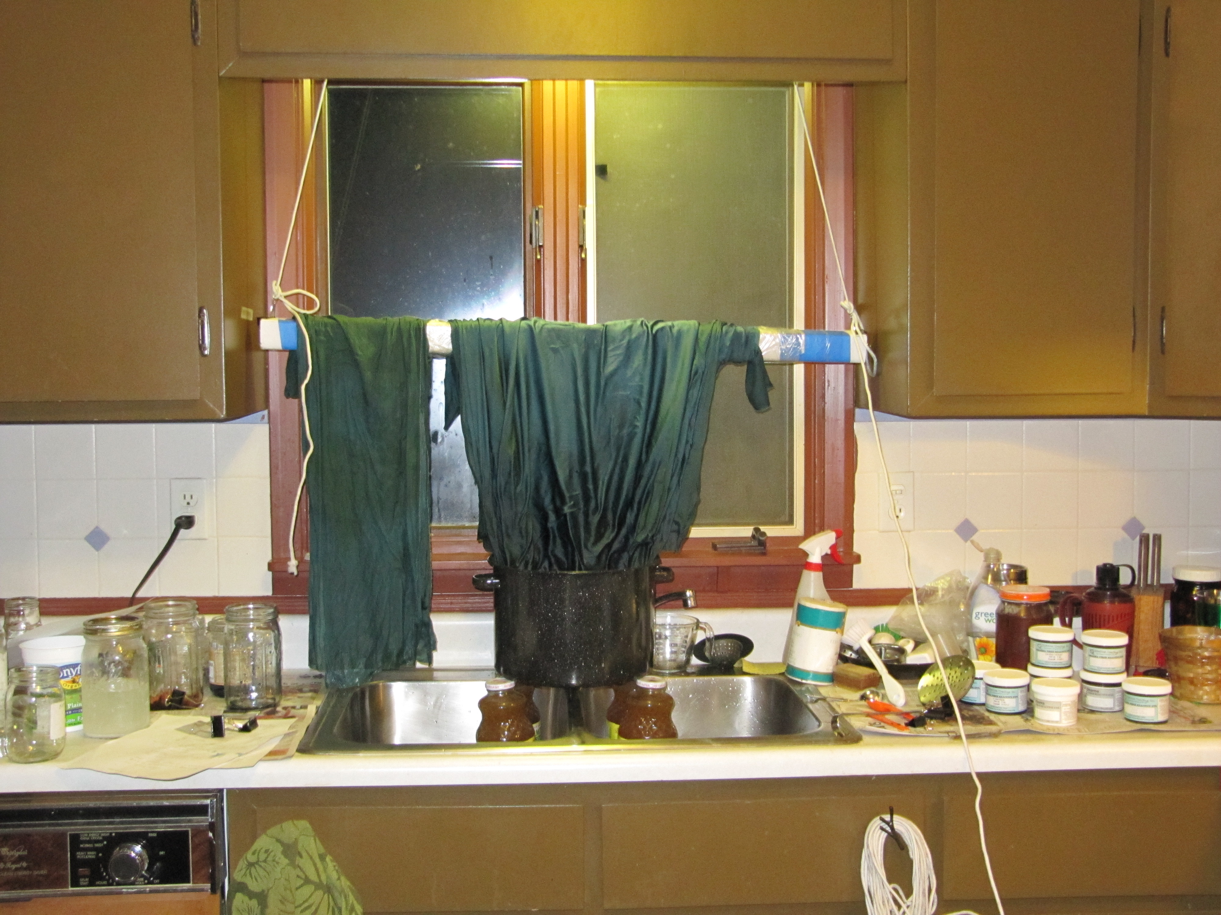 About an hour later: Over-dyeing in bronze using ombre technique. Pulley system still works. Yes, that IS a pot of dye precariously perched on four jars: an accident waiting to happen.