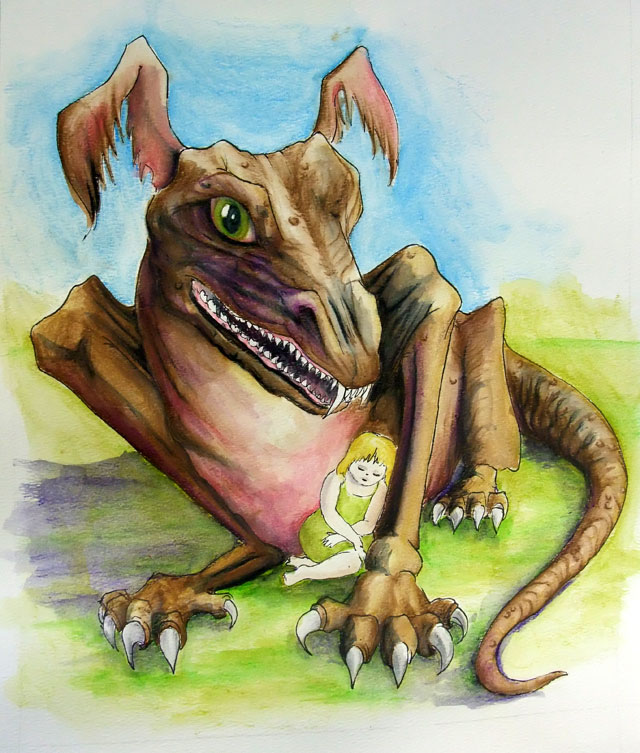 I think your monster is rather sweet. I was never really convinced that the maiden didn’t want to be with the dragon. Are you suggesting that dying is a bit overboard? Ah, well, I won’t take it personally and it could still end in complete disaster 🙂 And I don’t really like the way the colors turned out anyway. That blue doesn’t work for me.