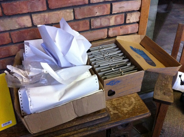 I have already found a way to make some of my clutter pay. One of my stored art projects, consisting of several 4×6″ photos in small clip frames, has been on my nerves lately. It has been stored in its original packing, which was optimal for moving, but less so for storage purposes. I found an underutilized Patagonia shoe box, which just happened to fit the entire project perfectly!