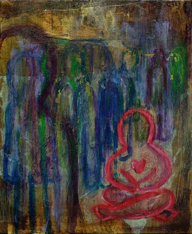 This painting was again from one of the group of boards that I prepared a while back. I have a lot of 8×10″ hardboards, so I can do small works until my hands fall off. Let’s see… we have collage, acrylic gel medium, alcohol inks, acrylic paints, water soluble crayons (like watercolor pencils, but fat and without wood), and some excavation (destructive/subtractive) techniques. It’s all in there but the fabric!