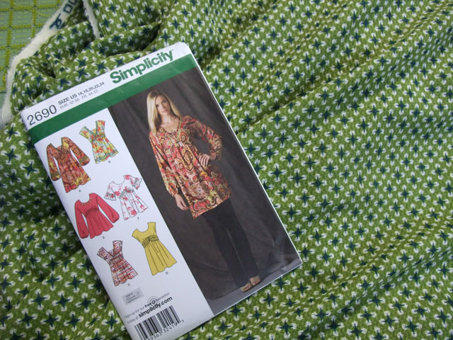 I haven’t tried this pattern before. In fact, I just bought it today. I’m taking a chance, though, because this cotton garment fabric, which is an odd waffle-weave-ish sort of number, only cost $3 a yard. That’s cheaper than muslin.