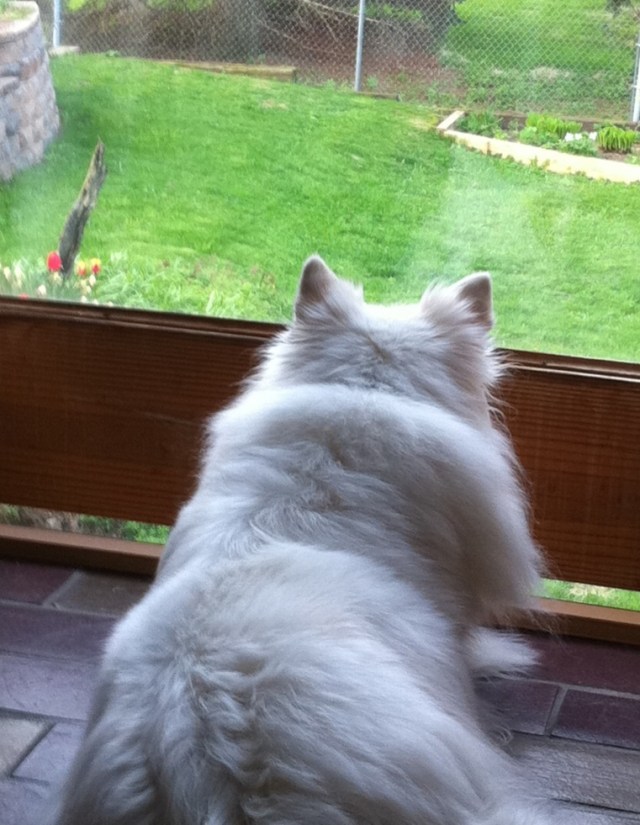 Zoe loves gazing out the back window to make sure no neighbors come within sight of our domain. American Eskimo Dogs are like that.