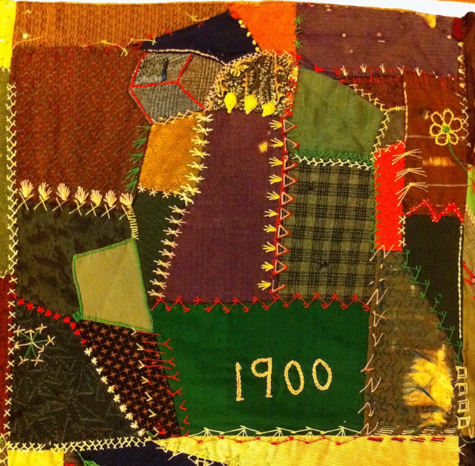 It’s made mostly of wool, with a cotton back. No batting, as is the standard for crazy quilts. The embroidery is done in wool. It has some awkward repair patches in some places, some of which I will probably remove to expose the stitching beneath, even if the fabric has disintegrated.