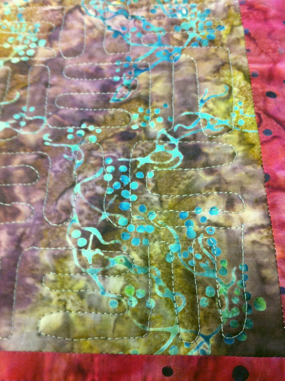 This free-motion quilting pattern is structured on a 2×2″ grid, which is marked my painter’s tape guides during the quilting process. I practiced it with pencil and paper before-hand, a good thing to keep busy while watching television.
