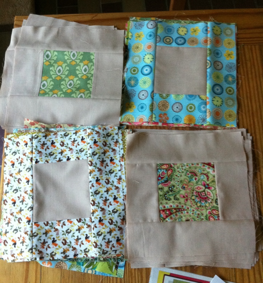 I finished the rest of the blocks for my bed runner last night. There are 56 eight-inch blocks total, using fourteen different prints, plus the solid, which JoAnn sells as a “tea dyed muslin”. I’m interested to see how the muslin washes up, because I was too lazy/impatient to wash it ahead of time. It doesn’t feel terrible off the bolt, but you wouldn’t want to curl up with it, either. I love the look of it, though, because it has little irregularities that you find in unbleached muslin. Because this isn’t a cuddly quilt, I decided to go with it.