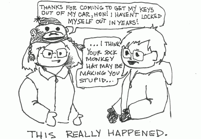 I live in Rockford, IL right now, which is where the red-heel socks were originally made. It is, in fact, the home of the sock monkey! A sock monkey hat is regionally correct here. (People dig it!)