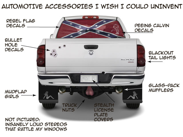 This entry was posted in Humor and tagged automotive accessories, bullet hole decals, funny, Humor, mudflap girl, peeing calvin, rebel flag decal, redneck, stealth license plate cover, stupid, truck nuts, ugly. Bookmark the permalink.