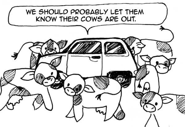 We had rolled down the windows to tell him about the cows, but in hindsight it was unnecessary. We shouted, “Your cows are…” and he was shouting for help before we finished the sentence.