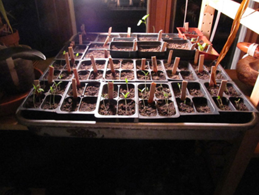 Under much scrutiny from those around me who know I’m capable of shelves myself, I took a get-‘er-done attitude and bought an Ikea shelving unit (I’ve never been to Ikea and, had someone told me what the Ikea experience was going to be like, I may have opted for making my own.  I mean, some guy almost sat on my head while I was there and he didn’t even think it was funny.).  The shelves still required some sanding and several coats of canary safe finish with Land Ark Wood Finish.  They’re not beautiful but they’re useful and efficient and now hold trays of planted seed.  Hopefully next year I’ll be able to purchase grow lights to aid in the process.