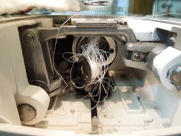 After all of this TLC, I asked my long-suffering husband to load Juki into her rightful place on my machine frame. Funny thing about putting a sit-down machine onto a frame: It’s darned awkward to get the bobbin case seated properly. Unfortunately, when you use a fast machine, it’s kind of like driving a fast car. The going is great, but the accidents are disastrous. This is what happens when the bobbin case falls out of a Juki going at top speed. This is also what happens when you forget to put the presser foot down and then start a Juki at top speed.