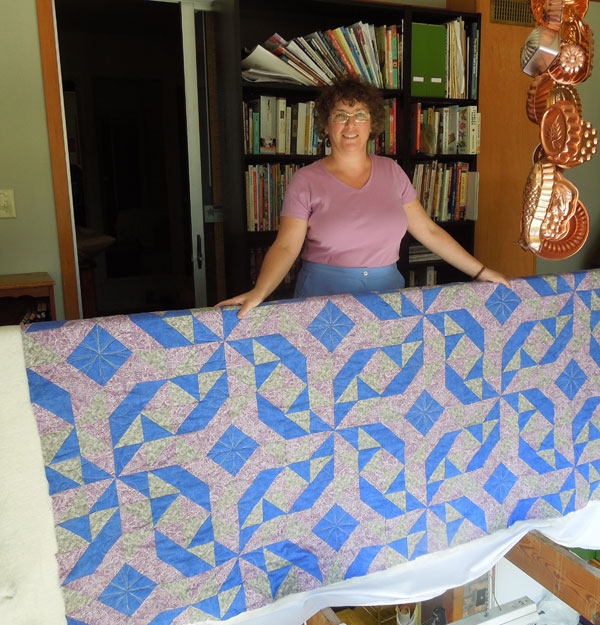 Here are some photos with her newly all-but-bound quilt. Syma is a “finisher”, so she’ll probably have it bound by the weekend.