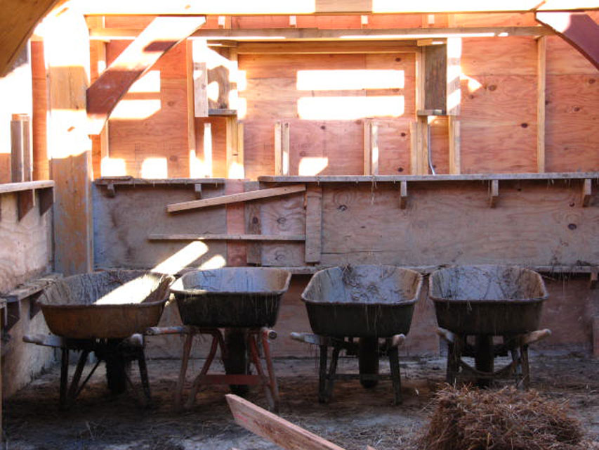 Wheel barrows waiting for the wall stuffing to begin.