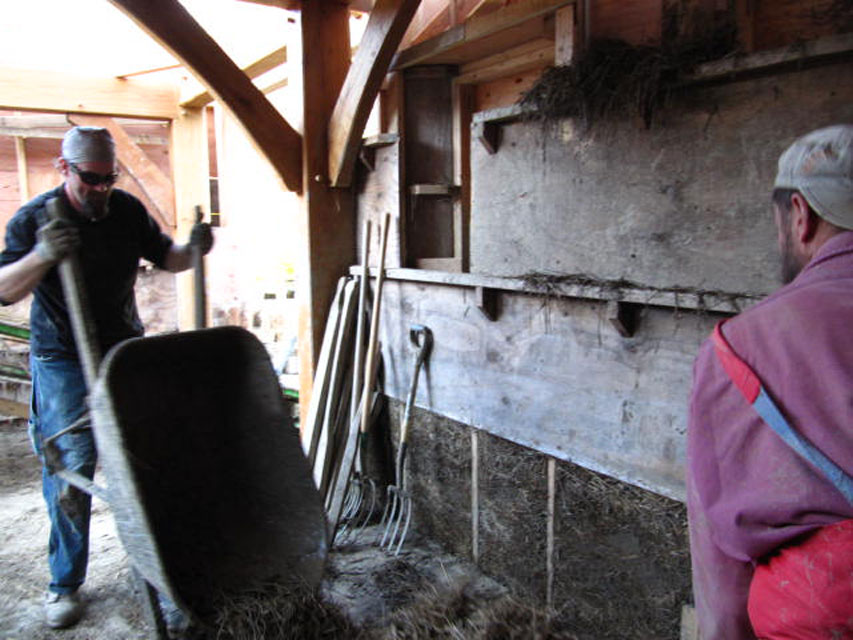 Once the mix comes off of the conveyor, it’s taken by wheelbarrow to wherever it is needed in the house.