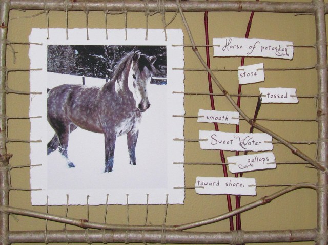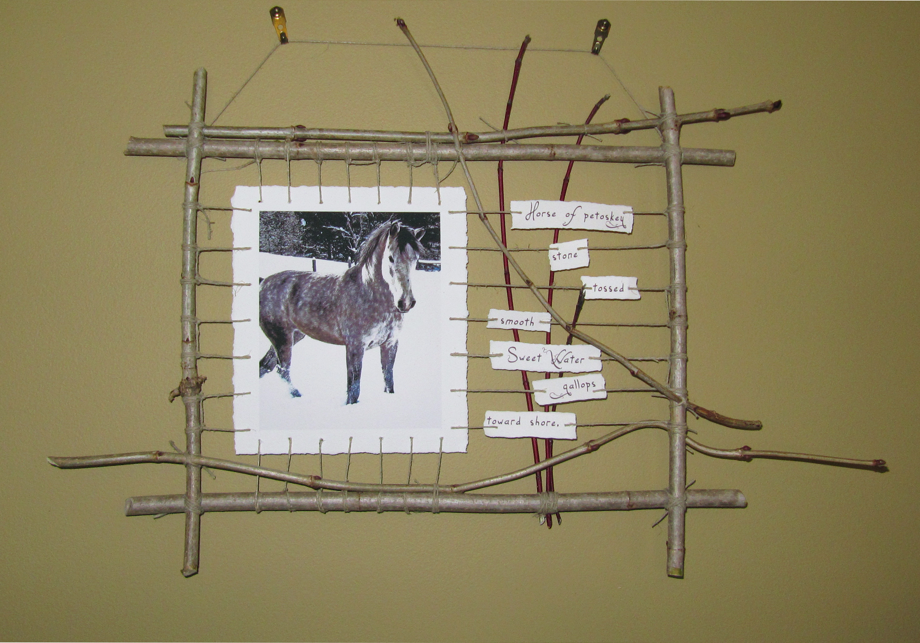 Yay! I managed to get two pieces ready for a show in one week. At least graduate school has me well-practiced at getting no sleep. So…my latest quandary? I can’t figure out how to hang these things. Clearly the Asian scroll method used on Horse Haiku is not going to work. It looks like a house: horse house.