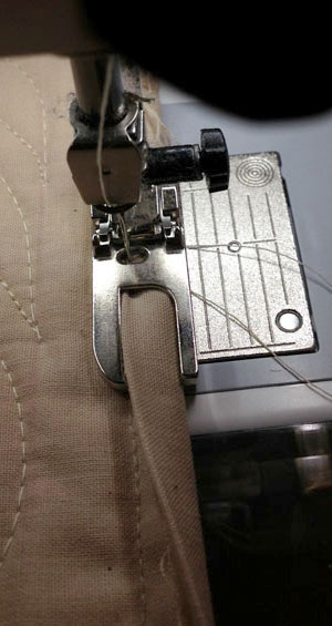 Lift your presser foot, with the needle still down, and pull the edge of the binding up so that it lies above the small inner edge of your flat fell foot. The right edge of your flat fell foot will be resting on the machine bed.