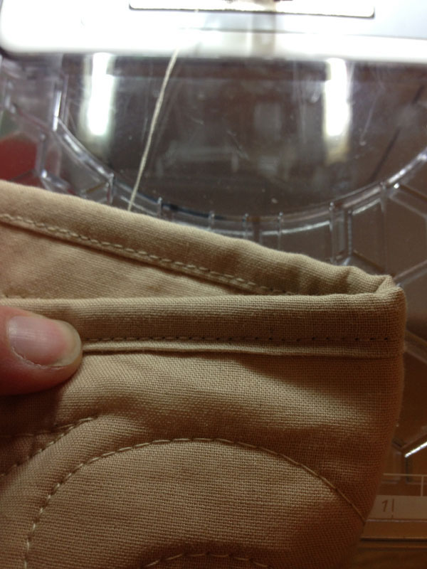 When you reach the end of your binding, simply lift your foot, pull the binding underneath, and sew until the end.