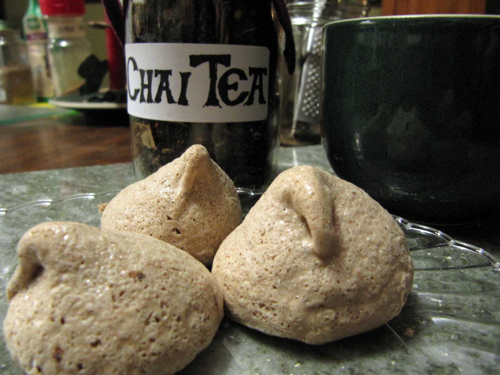 I’m famous for my inability to exactly follow directions, er…, recipes as well as for my ability to combine four similar recipes into one. This recipe is no different. This stems from a need to cook with ingredients I have on hand because there’s no way I’m making a trip to the store for just a few ingredients. I developed this recipe using the Chocolaty Meringue Stars recipe from “Betty Crocker’s New Choices Cookbook” and Debby Lovell’s Chai Meringues recipe from “Chai: The Spice of India” and, of course, the creative process unique to…me.
